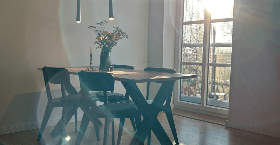 Der große Flur führt direkt in den offenen und lichtdurchfluteten Wohn- und Essbereich, der der ideale Ort für gemeinsamen Beisammensein ist. Der Esstisch, an dem 4-5 Personen Platz finden, ist der perfekte Ort für gemeinsame Mahlzeiten, für Gespräche oder für Spieleabende.